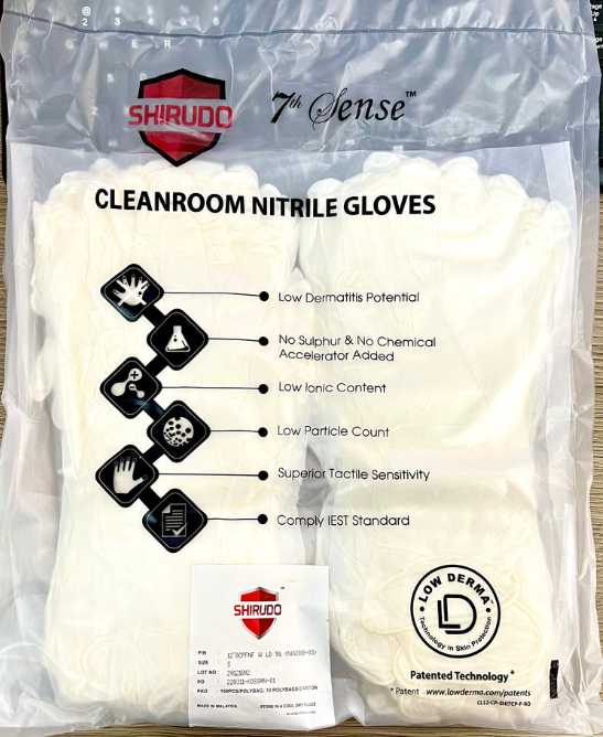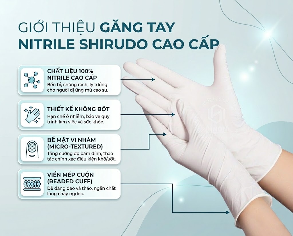 Găng tay Shirudo là dòng găng tay bảo hộ cao cấp, được thiết kế chuyên biệt cho các môi trường sản xuất công nghiệp yêu cầu mức độ sạch cao và khả năng chống tĩnh điện (ESD) nghiêm ngặt. Trải qua quy trình lưu hóa và làm sạch công nghệ cao bằng phương pháp clo hóa (chlorination) hoặc giặt nước DI (Deionized water), sản phẩm được loại bỏ tối đa các hạt bụi mịn và ion kim loại.