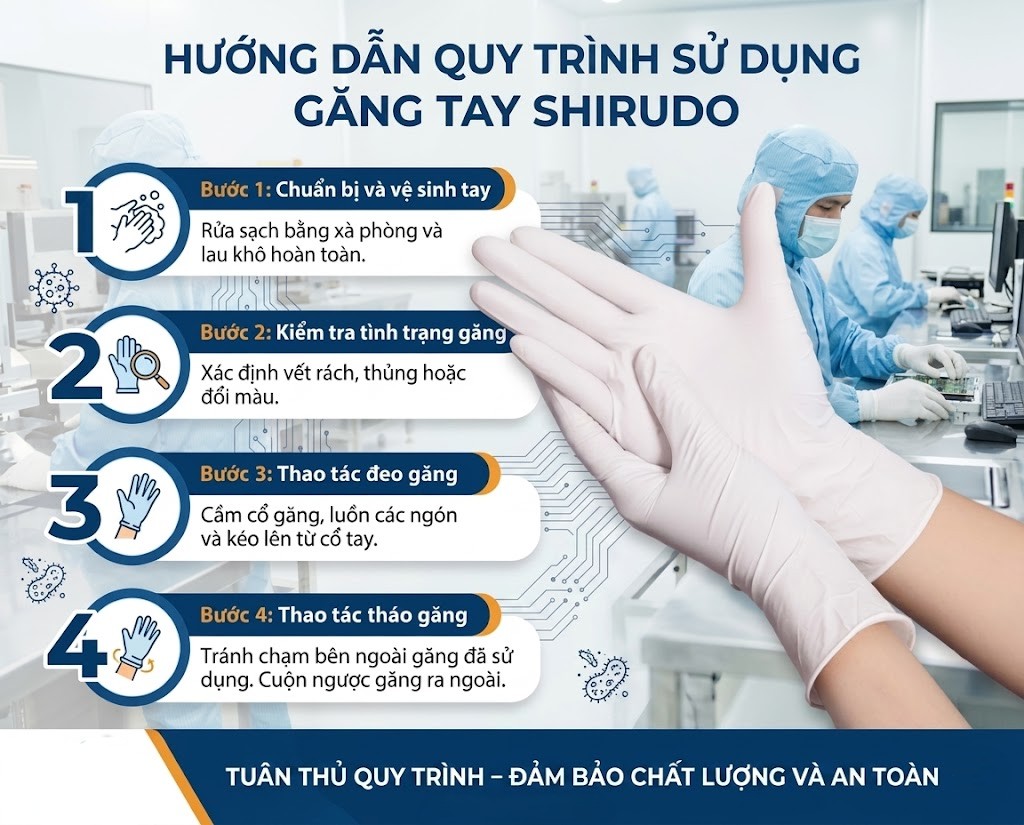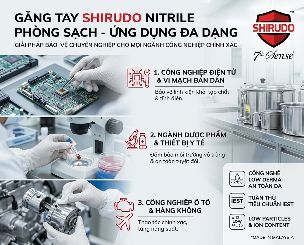 Trong sản xuất linh kiện điện tử, bán dẫn và dược phẩm, kiểm soát hạt bụi cùng hiện tượng phóng tĩnh điện là yếu tố sống còn. Để đáp ứng tiêu chuẩn khắt khe của môi trường phòng sạch như Class 100 hay Class 1000, găng tay Shirudo đã trở thành vật tư tiêu hao chuyên dụng bắt buộc.