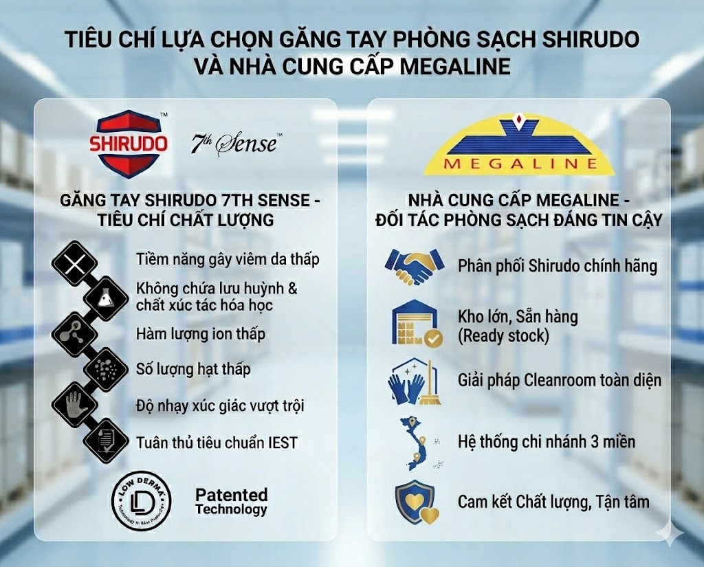 Là đơn vị phân phối hàng đầu về các giải pháp vật tư phòng sạch tại thị trường Việt Nam, Megaline tự hào đáp ứng trọn vẹn mọi yêu cầu khắt khe của các nhà thầu và xưởng sản xuất lớn. Khi mua găng tay Shirudo tại Megaline, khách hàng được cam kết bảo đảm 100% hàng chính hãng, cung cấp đầy đủ giấy chứng nhận nguồn gốc xuất xứ và chất lượng (CO/CQ).