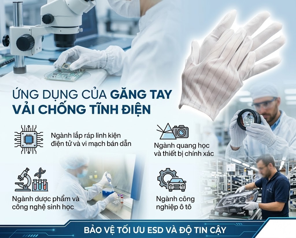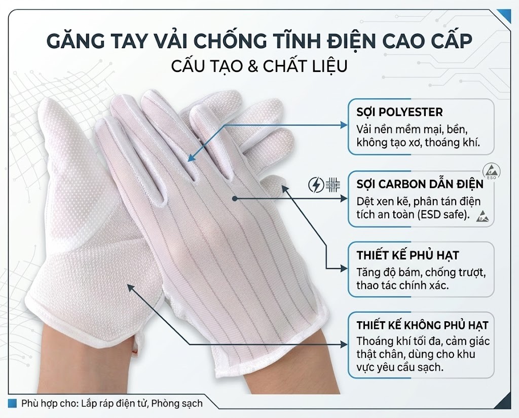 Trong sản xuất công nghiệp, đặc biệt là vi mạch bán dẫn và linh kiện điện tử, phóng tĩnh điện luôn là mối nguy hiểm tiềm ẩn gây hư hỏng bo mạch và thiệt hại lớn. Giải pháp triệt để và tiết kiệm nhất chính là trang bị găng tay vải chống tĩnh điện.