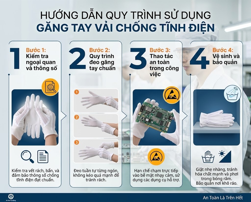 Để tối ưu hóa chi phí vật tư và giữ cho găng tay vải chống tĩnh điện luôn bền bỉ, phát huy tối đa công năng, người lao động cần tuân thủ quy trình sau: