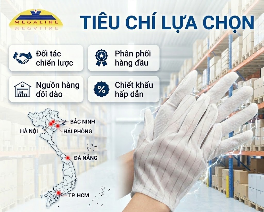 Megaline – Đối tác chiến lược cung cấp vật tư phòng sạch Đáp ứng hoàn hảo các tiêu chí khắt khe trên, Megaline tự hào là nhà phân phối thiết bị, vật tư phòng sạch hàng đầu. Lựa chọn Megaline, quý doanh nghiệp hoàn toàn an tâm sở hữu những lô găng tay vải phòng sạch, găng tay vải chống tĩnh điện chất lượng chuẩn quốc tế. Với tổng kho quy mô lớn, Megaline cam kết luôn có sẵn nguồn hàng dồi dào, đáp ứng linh hoạt cả dòng găng tay không phủ hạt mỏng nhẹ lẫn dòng phủ hạt PVC chống trơn trượt.